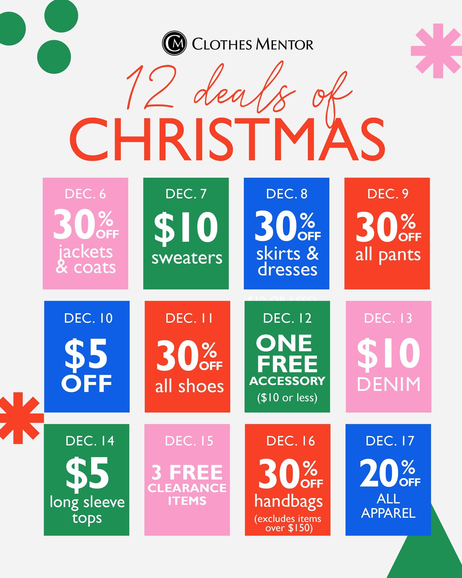 Celebrate the season in style with 12 Deals of Christmas! From December 6th through December 17th, we’re unwrapping a brand-new deal every day to help you save big on your favorite fashion finds. Score major markdowns like $10 sweaters, 30% off jackets, coats, shoes, and handbags, plus limited-time freebies including 3 free clearance items and a free accessory on select days. Stop in each day to discover the daily deal and treat yourself to stylish savings all season long!